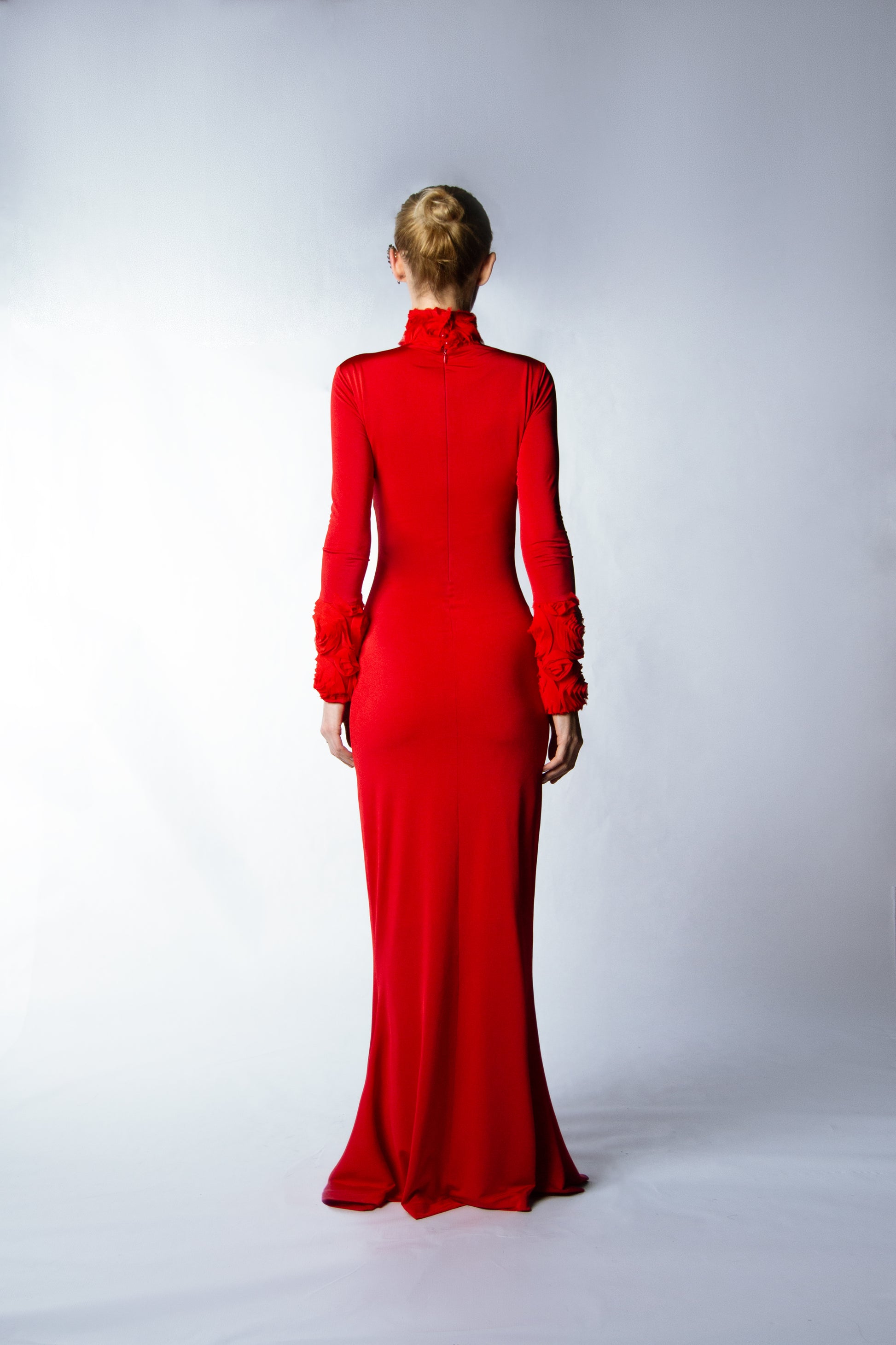 A bold red maxi dress featuring exquisite roses on the neck and wrists. Designed to captivate and command attention, this dress is a vision of fiery elegance and undeniable allure.